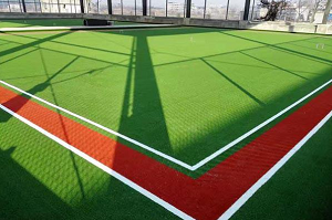 ② 按图纸的线条长宽规格裁钉球场线条,并配合经纬仪等工具粘好线条,经自查粘好后的线条必须平直。